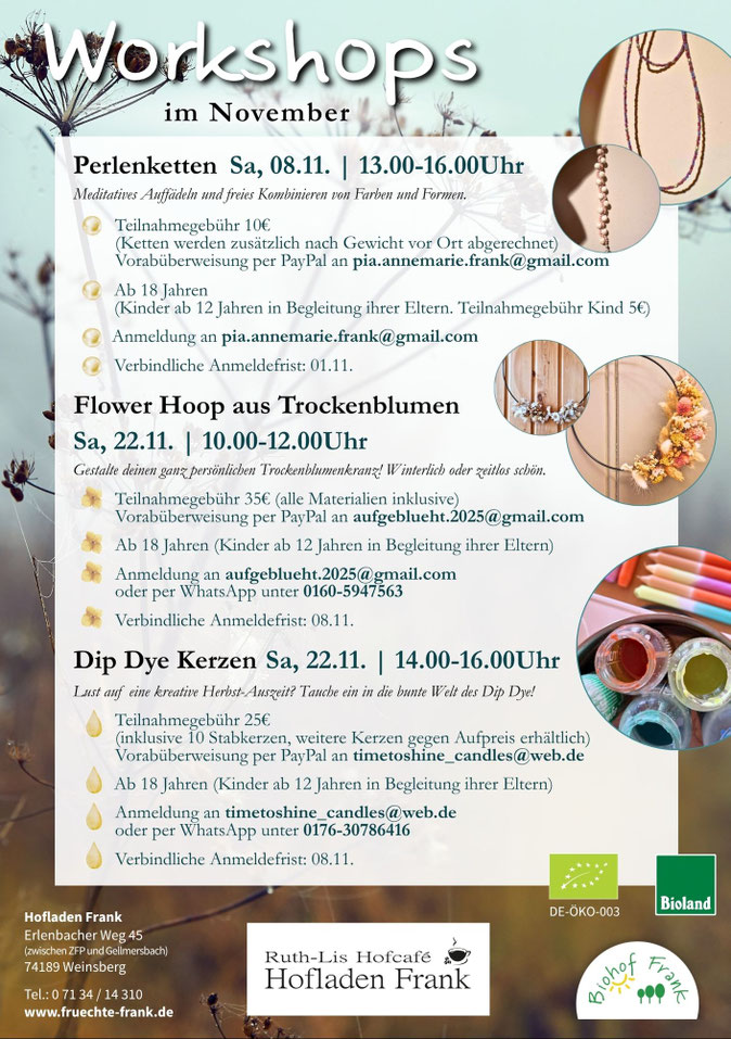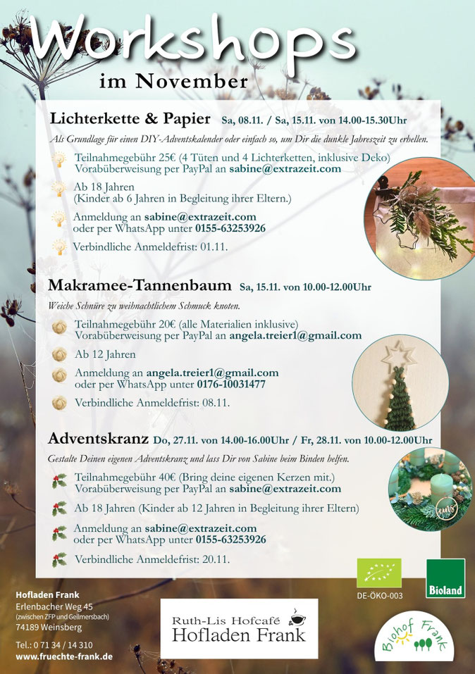 Anmeldung mit Bezahlung bis zum jeweiligen Freitag vor der Veranstaltung im Hofcafé in Gellmersbach oder per Überweisung an untenstehendes Konto.
