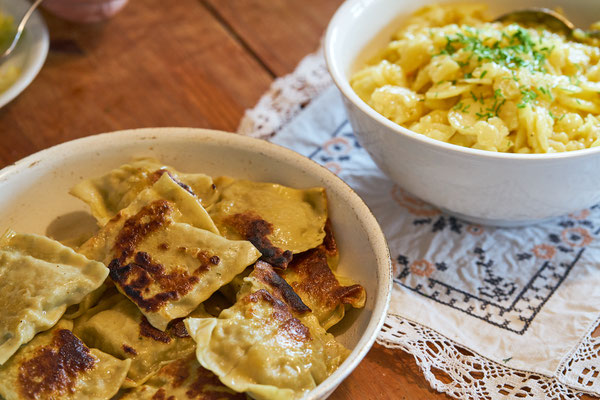 Unsere handgemachten biologischen Maultaschen mit Fleisch, vegetarisch und vegan - genießen Sie sie in den Variationen Maultaschensuppe, Maultaschensalat, Überbackene Maultaschen, Maultaschen-Burger und Gebratene Maultaschen. Dazu servieren wir verschiedene Salate.